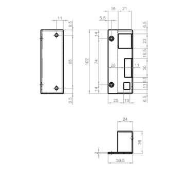 GÂCHE ENCLOISONNÉE POUR SERRURE D'APPLIQUE 2005 SCHÄNIS Gache encloisonné et à équerre contrefalle, pour portes à fleur s'ouvrant à l'intérieur et à l'extérieur
