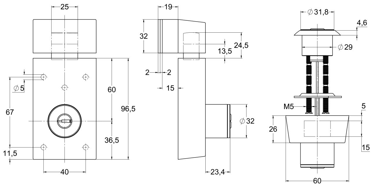 - Verrou avec cylindre intérieur et cylindre extérieur centrés pour portes profilées en acier, en aluminium ou en plastique ainsi que pour la sécurisation de fenêtres.